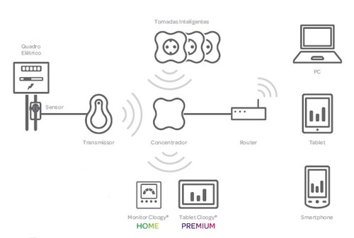 Um pequeno Sensor facilmente instalável no quadro elétrico comunicará toda a informação dos seus consumos, um Concentrador irá recolher os dados e mostrar-lhos no seu Monitor Cloogy tablet, computador e smartphone e através das Tomadas Inteligentes, poderá monitorizar e controlar à distância cada aparelho em sua casa!!